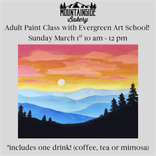 Evergreen Art School will be holding an Adult Sip & Paint at Mountainside Bakery where you will paint a lovely sunrise picture! The price includes all materials, step by step instructions, and one drink of your drink of choice which includes coffee, tea, or a mimosa! The event is 21+. Email Jules with any questions at evergreenartschool@gmail.com and you can register on Evergreen Art Schools website or follow the link below. Hope to see you there!