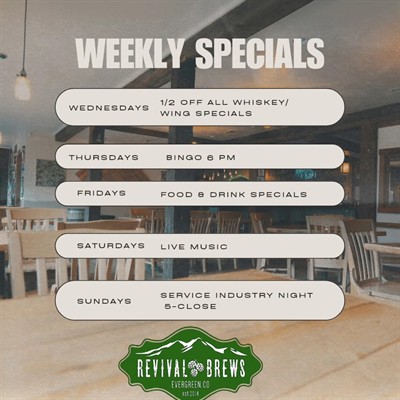 Revival Brews downtown Evergreen Free parking for customers