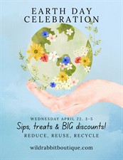 Wednesday April 22. 3-5pm. Here at the shop! Big discounts on recycled clothing and natural bath and body items! Sips, treats & BIG discounts!